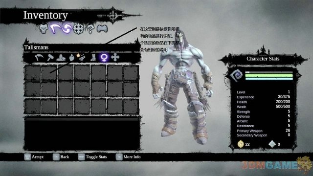 基础教程 对于一款动作类游戏而言的话,其基本的操控并不是过于复杂。但是由于本作有着大量的解密要素,所以从另一种程度上说也一定程度上加大了本作的游戏难度。这里还是简单说明一下基础的操作吧。 移动还是简单的WSAD模式。鼠标左右键则是进行相应的武器攻击,SPACE则是跳跃,O则是打开人物菜单进行各项属性的调整,ALT则是翻滚,E则是与特殊物件进行互动(如游戏中的ACTION提示)。在游戏新档建立之初,你将进行游戏难度和GAMMA值的调整;当然这些你也可以在游戏进程之中进行相应的选择说明。