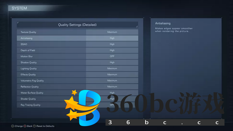 大多数设置都将有低、中、高三个选项,有一些还有“最高”选项。抗锯齿则有低、高和关闭。