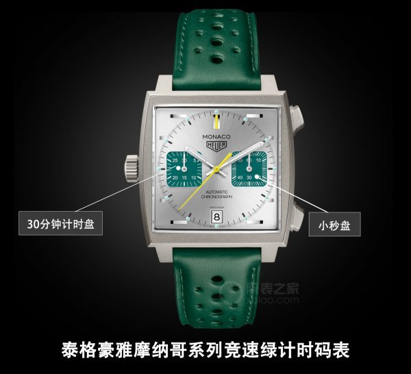 [腕表之家 腕表品鉴]泰格豪雅继去年带来了法国“竞速蓝”摩纳哥特别版腕表后,今年再度以英国代表色做主要色系,带来了全新英国“竞速绿”摩纳哥限量版,新品配色复古、时尚,令人联想到1902年Selwyn Edge赢得“戈登·班尼特杯”(Gordon Bennett Cup)冠军时驾驶的Napier 50著名赛车。标志性的竞速绿色调与白色、黄色相互映衬,其装饰元素取自英国的古董赛车,带有浓郁的英国绅士风采。 下面,请看新品设计细节:(腕表型号:CAW218E.FC6565)
