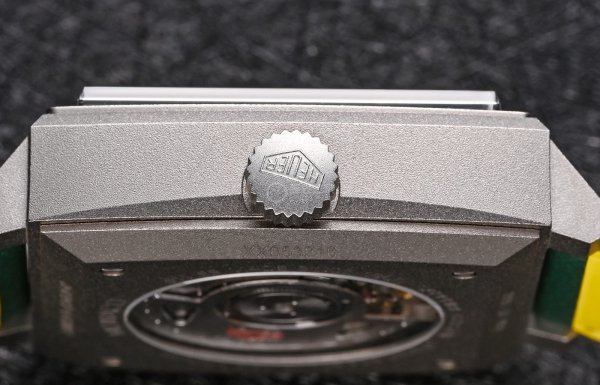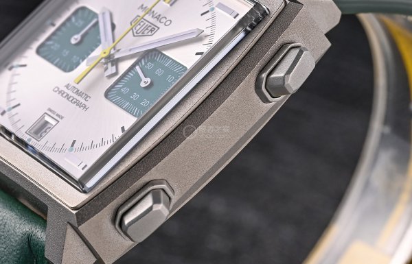 侧面设有两个复古计时按钮,分别为启动暂停、归零。与常规计时码表不同,这枚摩纳哥表款的表冠设于表壳左侧,颠覆了传统表冠设计。这种设计是因为初代摩纳哥腕表搭载了当年世界上第一枚模块式自动计时机芯——Chronomatic Calibre 11机芯,初代摩纳哥便将表冠移步至左侧,象征其计时表款无需手动上链,如今这枚表款便是延续这一标志性特征。