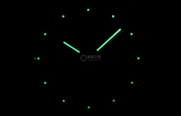 圆形内圈上设有12个覆以淡绿色Super-LumiNova®荧光涂料的圆点标记,时针和分针上则采用蓝色Super-LumiNova®荧光涂料,提供腕表夜间读时功能