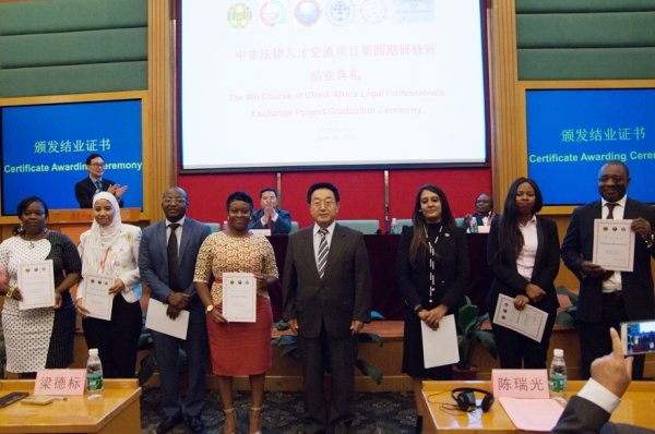 张鸣起副会长为学员颁发“中非合作论坛-法律论坛”咨询员聘书 结业典礼的最后,张鸣起、梁伟发、隋广军为本期研修班的优秀学员颁发了中非合作论坛-法律论坛咨询员聘书,中国-非洲法律研究中心研究员聘书,中国-非洲法律培训基地咨询员聘书。胡充寒为学员颁发了中非法律人才交流项目第四期研修班结业证书。