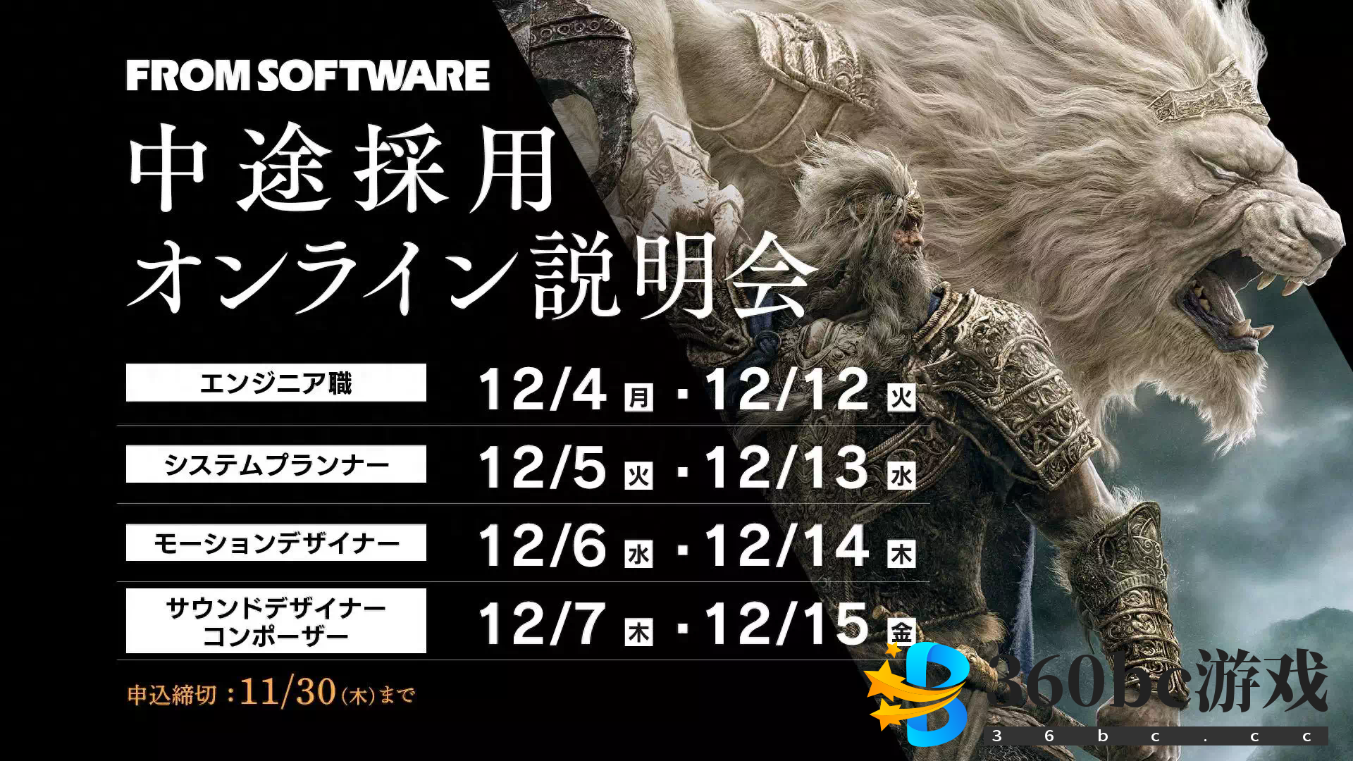 10月24日,FromSoftware宣布将举办经验丰富的游戏开发者职业中期招聘在线说明会,并已开始接受参与申请。本次说明会是为FromSoftware多个新项目做准备而举行的,除了FromSoftware公司的概要外,介绍过《装甲核心6》、《艾尔登法环》等新作品的现任开发人员会对具体工作内容进行说明。此次招聘主要针对四个种类的工作:工程师、系统规划师、动作设计师和声音设计师/作曲家。 ![]() |