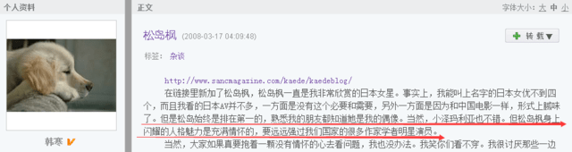 而韩寒最喜欢的是松岛枫,08年博客盛行时,韩寒曾做了一件特轰动的事儿,他在自己几亿阅读量的博客(当时他的博客阅读量排名第二)上撰写了一篇题为《松岛枫》的博文,文中对松岛枫大加赞赏。