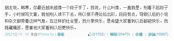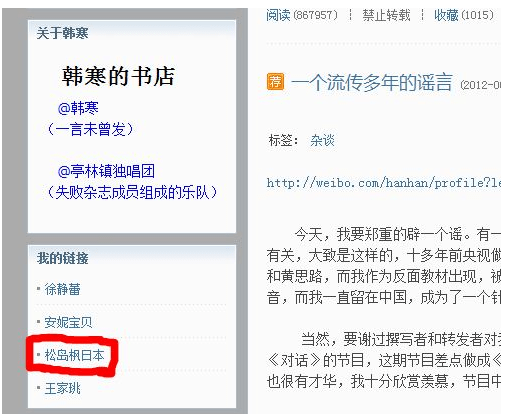 同时,因为他在博客上贴出松岛枫的了博客链接,致使他的粉丝纷纷涌进松岛枫的博客,令松岛枫点击量急速攀升,也一度出现不能访问页面的情况。 对此,松岛枫博客所在的网站不得不在其博客中发表道歉声明,声明中称,因为“中国的某有名青年作家先生,在其本人的博客中,写了关于松岛枫小姐的评语,并添加了对这个网站的链接”,突然聚集了庞大的访问量,令网站一时瘫痪,不能正常访问。