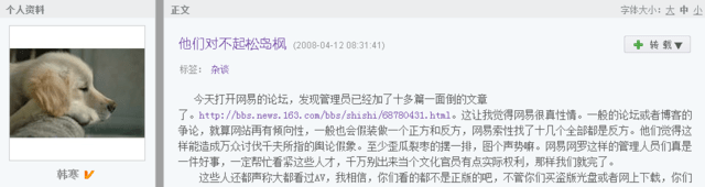 而韩寒随后又连续在博客里发布《他们对不起松岛枫》《看过“成人网站”后的反馈》《一种重要东西的倒退》等数篇博文,对松岛枫及其博客网站瘫痪事件发表自己的看法,也引起各界回响,当时很多知名写手、博主都纷纷撰文讨论此事,从而演变成一起网络事件,受到各大媒体的广泛关注。 所以老司机,岳父韩寒绝对实至名归。 (责任编辑:蚂蚁团队) |