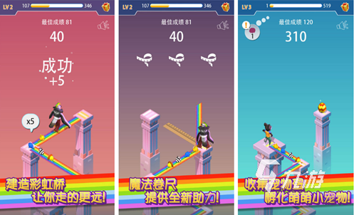 缤纷多彩的配色和礼盒造型的跳桩,配上治愈有趣的文案让游戏脱颖而出,游戏所提供的关卡很多,礼盒间距离各不相同,你需要根据分析进行控制跳跃力度。花式棋子造型随你选择,浅色调的背景图让人莫名觉得身心放松,每一次关卡挑战都需要你精准把控跳跃距离和触屏时间,快来挑战手速吧。 2、《彩虹跳一跳》