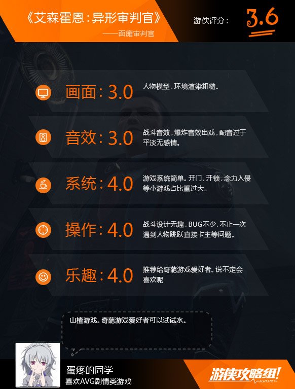 【“面瘫”审判官的回忆录】 《艾森霍恩:异形审判官》是一款多平台发售的冒险AVG游戏,但是如果了解到在PC之后接下来发售的平台是针对IOS和安卓的移动端,各位玩家们是不是就有些慌了呢。笔者这就特地在通关了游戏之后再给大家带来对这款游戏的一些看法和评价。希望能够让还没有接触本作玩家有个大致的了解,帮助玩家们选择游玩。在本作中游戏采用了一种倒叙的方式,由艾森霍恩的声音缓缓叙述着他从前经历过的那些危险,惊心动魄的任务,故事由艾森霍恩追捕一名叫做莫丁.艾克隆的惯犯开始说起,我们也跟随着艾森霍恩的视角走进了这个正处于休眠期的星球-哈布里斯。