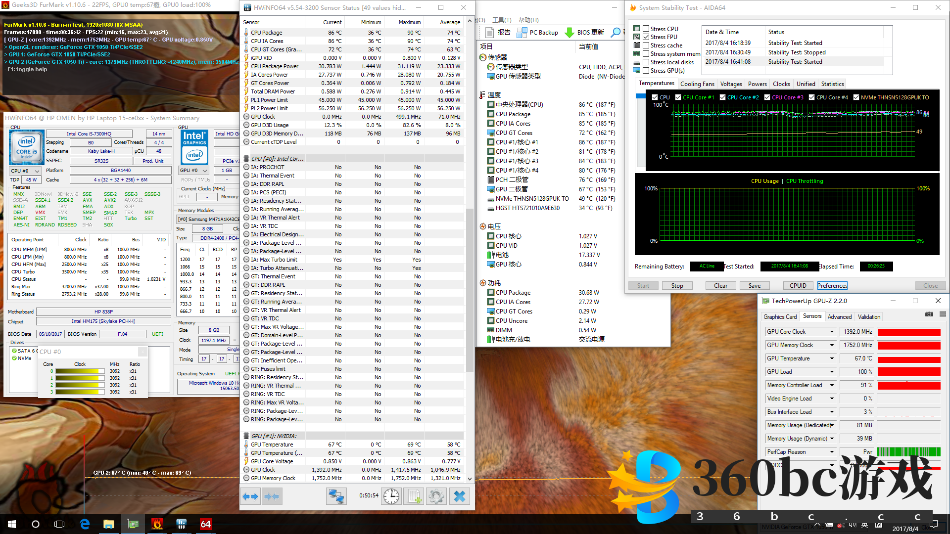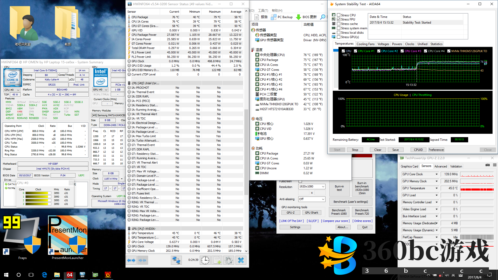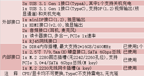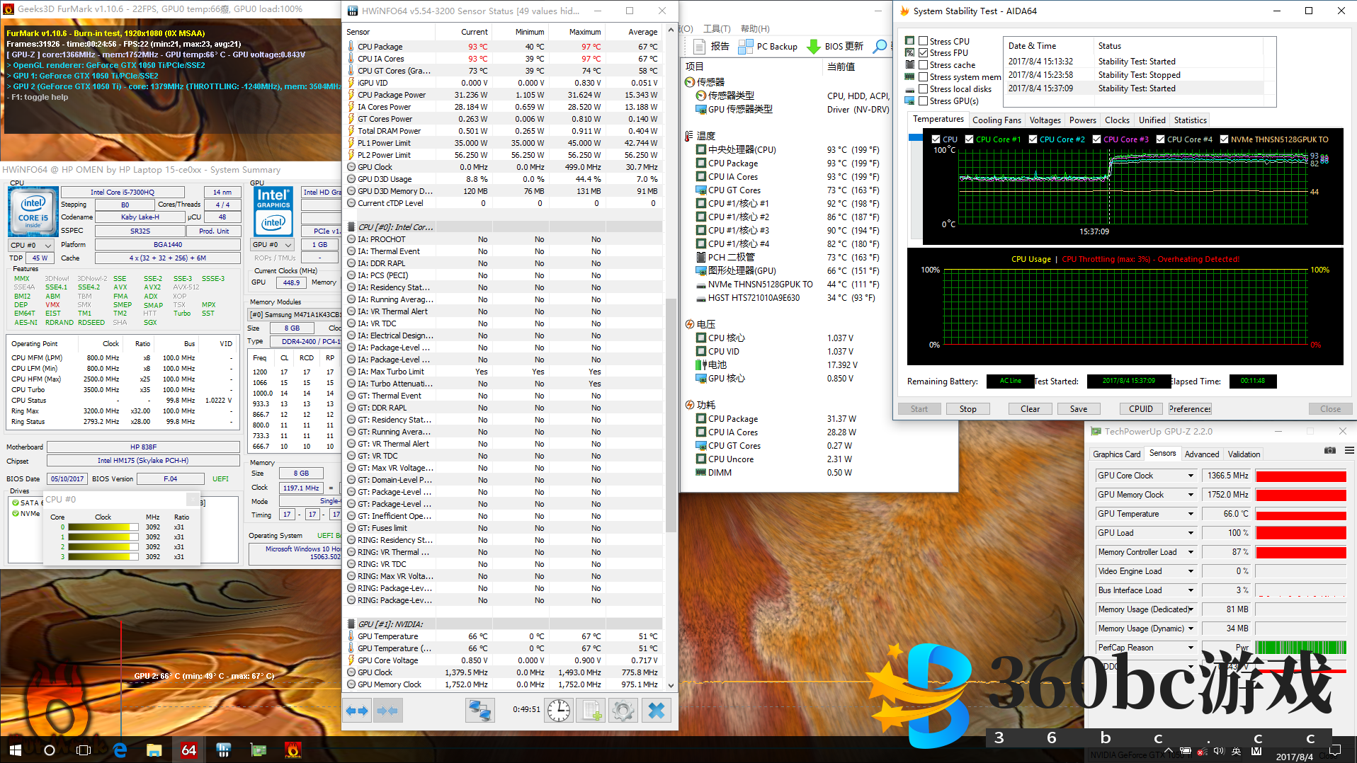 ![]() ![]() ![]() 笔吧评测室的评测为原创文章,转载时请标明出处和作者,欢迎大家的转载。 PS:图片点击即可放大 目录 【0】视频 【1】简评 【2】配置&参数 1.CPU 2.显卡 3.主板 4.内存 5.硬盘 6.电池 7.屏幕 【3】性能 1.CPU&内存 2.显卡 3.硬盘&其它 【4】游戏 1.巫师3:狂猎 2.刺客信条:枭雄 3.古墓丽影:崛起 4.战地1 5.泰坦陨落2 6.看门狗2 7.量子破碎 8.幽灵行动:荒野 【5】散热&评价 0.待机 1.CPU烤机 2.GPU烤机 3.CPU+GPU双烤 4.游戏温度 5.表面温度 6.散热模块 7.小结 【6】拆解 【7】其它测试 1.功耗 2.噪音 3.续航 【8】总结 【笔吧评测室】屏幕素质最好的主流游戏本?惠普暗影精灵III代电竞版评测_数码_科技_bilibili_哔哩哔哩https://www.bilibili.com/video/av14478640/视频部分可以直观的看到整机的外观和外设效果,并且简单介绍了各方面的参数和性能,一般的消费者观看视频即可了解到绝大部分的信息。欢迎大家在视频中吐槽,我们会根据视频留言逐步改善内容,使得视频更加完善,逐步取代图文的内容。 本章是为初学者以及某些不愿意详细了解评测的人士准备的。不过,这类简短的总结或多或少会夹杂笔者的主观看法在其中,并非客观的描述机器的特点,建议有能力者将整体评测浏览完毕,以消除部分主观的因素。 PS:本节采用评分的方式来展现不同方面上机器的表现,★为1分,☆为0.5分。评分范围0-5,意味着大部分机器都只有3分左右,表现很差就是0分,只有很出色的才有接近5分的可能。 再次谨记,这是主观评价,无法和所有玩家的想法一致,本节评价仅供参考。 下面介绍配置和参数。 暗影精灵3是私模,模具代号为G3AA,为广达设计和制造。1代和2代暗影精灵同样为广达设计,模具代号为X1PD/G35A。虽然2代和3代模具代号很相似,但无论是内部结构设计还是外观上都有本质的区别,是完全不同的两个模具 此次评测的机器具体型号为OMEN 15-CE007TX,媒体测试机。测试机为中配,低配除了没有固态外,显卡的规格降至M1050 2G,而高配则是i7-7700HQ,只要没有标注电竞版的屏幕都只是45%NTSC的低端IPS。 主要机器参数: ![]() 接口分布: ![]() PS:USB3.1 Gen1(TypeA)就是一般大家所称的USB3.0,由于最新规范中将3.0说法并入3.1中,很多厂商都开始玩起了文字游戏,只要注意Gen1还是Gen2就可以避免被误导。TypeA和TypeC也只是接口形状变化,和速度快慢无关。尤其要注意TypeC的宣传,此接口既可以是3.1也可以是3.0甚至2.0,而支持DP视频输出以及雷电3都是可选配置,TypeC≠USB3.1+雷电。 这一代暗影精灵3的接口有所升级,USB全部是3.0,多了一个带视频的TypeC但不支持雷电,也有了miniDP接口。不过内部拓展性上还是一样,在15.6寸游戏本中属于中等偏上的拓展性。有一点需要提醒一下,测试机的固态为XG4,实际量产机应该为三星PM961。 鲁大师硬件参数截图 ![]() 鲁大师识别出了品牌和型号,准确无误。 ![]() i5-7300HQ,七代Kaby Lake架构,BGA封装不可更换。四核四线程,支持Intel睿频加速技术,主频2.5GHz最大睿频3.5GHz,L3缓存6MB。14nm制程,热设计功耗45W。7300HQ相比6300HQ提升了0.2GHz的主频,睿频提升了0.3GHz,其他似乎没有变化。 ![]() HWINFO截图,CPU是正式版产品,封装为BGA1440,S-SPEC为SR32S,步进B0,最低倍频8x。 ![]() AIDA64里的CPUID截图,可以看到睿频为35x/33x/32x/31x,刚好都是比6300HQ多3个倍频。短时睿频功耗限制56.3W,持续时间28秒,长时睿频功耗限制45W,软件显示这些数值是Unlocked,说明可以用XTU解锁CPU功耗。 ![]() XTU信息,这是Intel的官方调节工具,可调节很多CPU参数,甚至内存参数。暗影精灵3无法调节倍频但可以调节电压和功耗限制,其中电流限制默认为70A。 ![]() 暗影精灵3的独显型号为mGTX1050Ti,4GB显存(三星颗粒)。厂商标识为HP(103C),这就是惠普的设备ID。默认频率1493mhz,boost频率为1620mhz,显存频率等效7008mhz。显卡核心采用GP107核心,启用6组SM共768SP,显存控制器有2组,为128BIT。这代笔记本GTX系列显卡已经彻底抛弃了原本的“M”后缀命名方式,跟台式机型号完全一致,我们前面加“m”是为了跟台式机稍有区分,“m”代表‘mobile’即移动版,毕竟具体参数上和台式机同型号卡还是稍有不同的。台式机1050Ti公版的规格与M1050Ti大致相同,但后者标称频率更高点,然而TDP还是不同的。 ![]() M1050Ti的电压频率截图,最高boost频率为1746.5MHz,满载核心电压为1.075V。不过这个频率并不能坚持很久,小渲染一段时间后频率会缩水,14nm工艺对于温度更敏感。 ![]() CUDA-Z截图,这里显示了GPU有关CUDA的详细参数。 ![]() NvidiaInspector截图,这里可以看到独显(N卡)的某些其他信息,比如可超频范围,电压调节范围,高温降频线和TDP控制阀等。M1050Ti不可解锁TDP控制阀,降频线为92℃。原来的M结尾笔记本显卡,都只有135MHz的可超频空间,现在的M1050Ti跟台式机显卡一样,相当于解锁超频限制了。 ![]() 主板信息,制造商显示为HP,模型为838F。芯片组为Kaby Lake,PCH是HM175,BIOS类型为AMI,日期2017-5-10,版本F.04。 ![]() AIDA64中的北桥信息,Intel早在二代酷睿i系列就将北桥整合进CPU中,主板上已经没有实际意义上的北桥了。北桥的主要作用是负责和内存的通讯和PCIe中显卡的通讯,核显的通讯也在北桥中。 从显示信息上看,7代标压U原生支持DDR4-2400(实际6代也支持),机器最大支持64G内存即四个插槽(实际只有2个),支持VT-d(当然也支持VT-x),核显已启用,独显M1050Ti占用x8带宽。 ![]() 南桥信息,实际上Intel的新酷睿平台也将部分南桥的功能整合到CPU中,