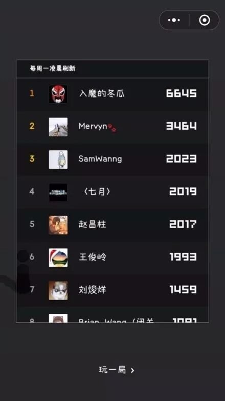 你只需要“长按”屏幕储蓄需要跳跃的能量,按的时间越长,棋子跳得越远。 每次跳板间的距离和跳板的弹性不一样。 尽管微友们热情似火,不停地跳、跳、跳…… 第一把得了79分,骄傲的呢, 接下来弹出的排行榜让我懂得了什么叫做江湖险恶, 我是谁?我在哪?我要干什么?狠玩了两个小时刷到100分,尴尬的事情出现了,继续淹没在排行榜里,那些比你优秀的人依然在坚持,这是要干撒! 然而,你会发现,费尽心思跳了一下午也没超过200分 但自己的排行榜里有人已经直奔1000分了,甚至已经上万分了。