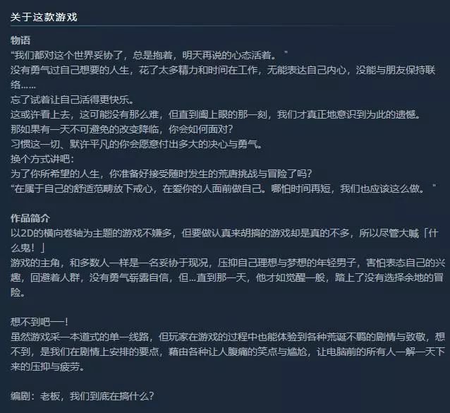 对于这款游戏,制作组的宣言如下: 以2D的横向卷轴为主题的游戏不嫌多,但要做认真来胡搞的游戏却是真的不多,所以尽管大喊「什么鬼!」 以近战与远程攻击、必杀技来击倒敌人,并随着游戏进度的推进,我们将体验到制作组的各种恶意与善意。“噢!没错,就是这个触感,这个味道!” 嗯,没错,你们的心情,小编确确实实的从游戏名里面Get到了。