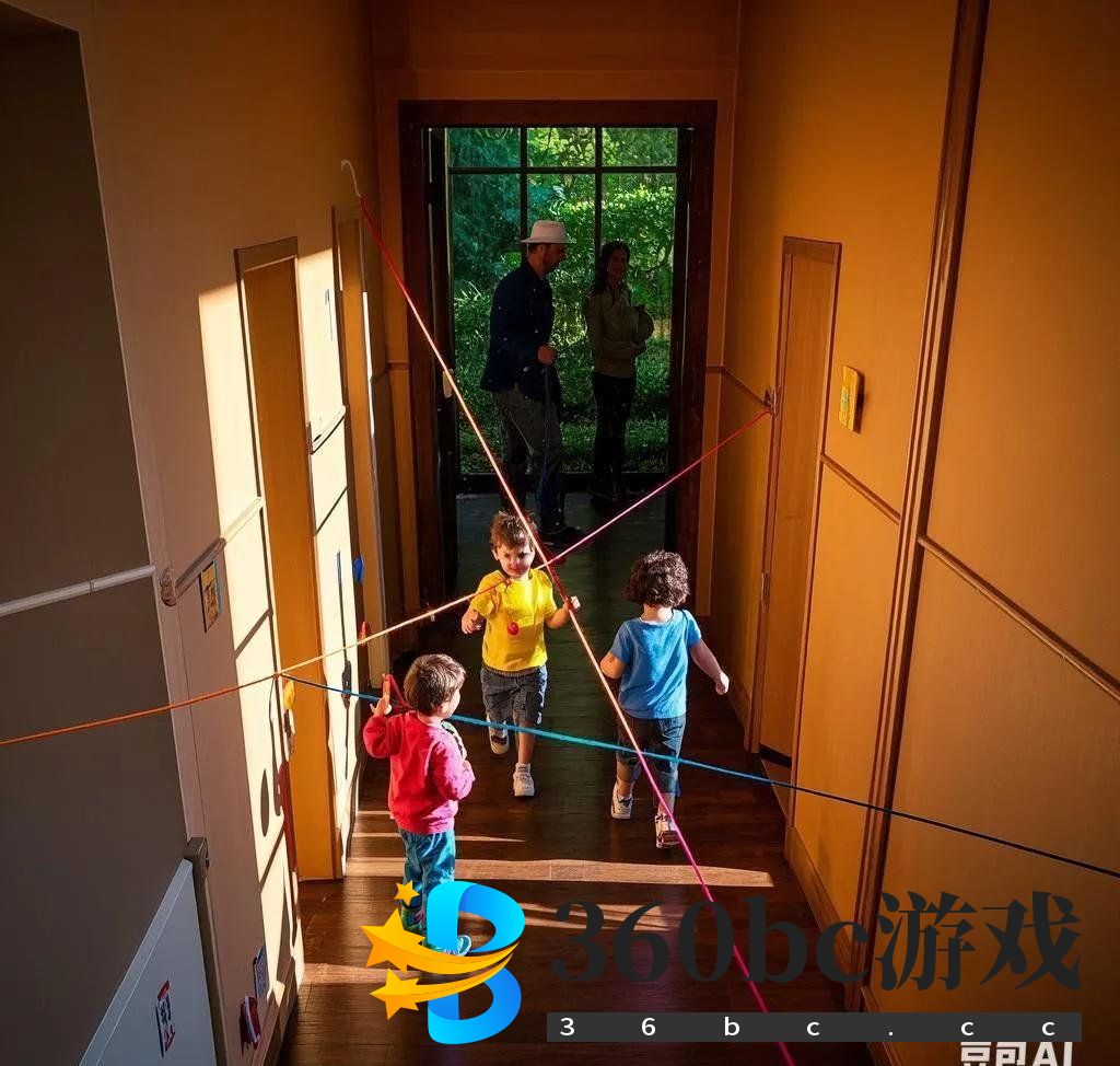 让孩子像电影里的特工一样穿越"激光阵",碰到线铃铛响了就任务失败。