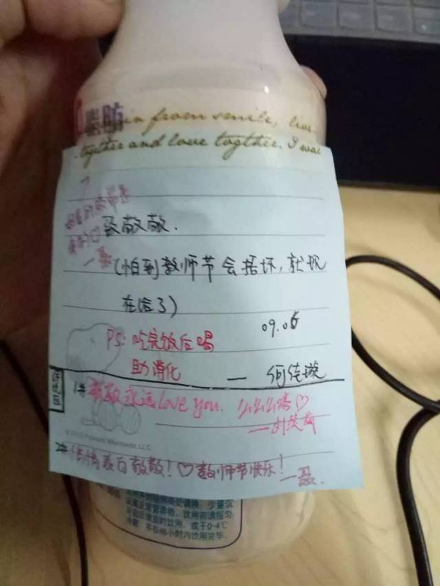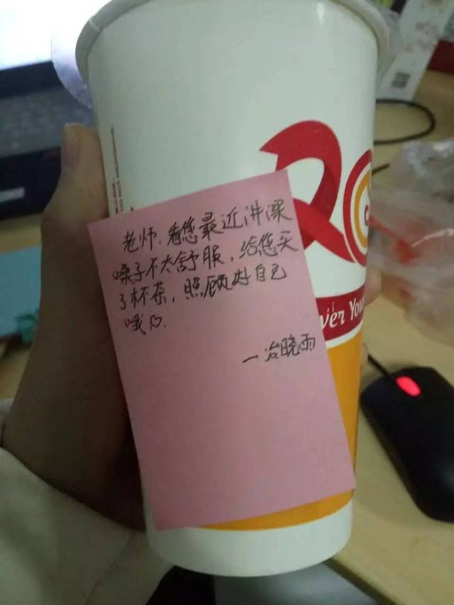 今年暑假放假前的最后一节课,敬敬在讲台上讲话,发现少了个孩子,同学们告诉她这个学生去洗手间了。 “我刚说完那我们先不等他,教室突然暗了下来,这个学生进了教室,端着一个大蛋糕:上便是她的大照片,写着:敬敬女神,我们永远爱你。” 在敬敬心里,短短三年的从教生涯,虽然有被学生气哭的经历,但更多的感动,痛并快乐着。 班里的一个学生一直想要报考武汉大学,敬敬专门托那边的同学购买了武汉大学的校徽、校服等纪念品,送给这个学生,这个学生特别感动。 “你对孩子们真心好,他一定可以感受到。”升入高二,她之前带的班级学生因为文理分科不再同一个班级,可在她的办公桌上,还是能经常收到他们的惊喜。 附着“敬敬大宝宝,公开课讲完可以好好休息一下啦!”小字条的棒棒糖,贴着“要吃饭哦笑脸”即时贴的酸奶,写着“我很甜,吃了我”的大橙子……
