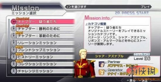 フレンドシップミッション:各种同伴出没的任务...也是刷共感的好办法... ヒストリーミッション:原作剧情的任务...出现方法同样是剧情模式进度,另外这里的有的任务做了后才会出后续... コレクションミッション:特定种类的MS出击以及出现的关卡,方便刷图纸.. チャレンジミッション:难度高(出现难度也高=3=)的任务...前期不要指望... チュートリアルミッション:练习关卡,刚玩的人可以搞这个先适应下... メモリアルミッション:纪念奖励任务,达成一定条件后出现,比如1000机斩,完成100个任务,MA 20只斩,FILED 500个制压等等。这些任务打了之后有的会奖励新的人物技能,图纸RANK掉落提高等等。 スペシャルミッション :通关后奖励的钱比较多的任务..(刷钱还是推荐单挑任务=3=)