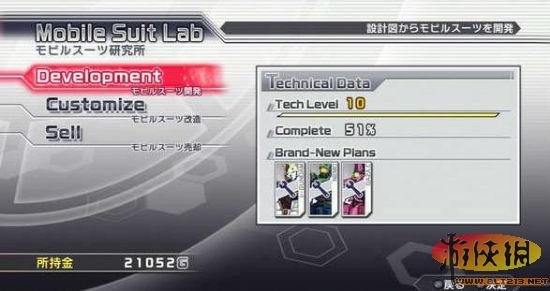 开发:开发是要靠图纸的,图纸是靠关卡里面拿到的...首先你控制的那个机体,过关后肯定会有他的一张图纸,其他机体的图纸是看你在该关中所击杀的机体..有时候会掉,尽量保留RANK 高的图纸...开发的时候可以选择图纸,然后花钱把图纸变成真正的机体...同一台机体可以储存4台,目的是为了让同一台机体可以偏向不同的能力,比如一台偏射击,一台偏格斗 改造:改造分为两种,一种是机体本身属性强化,从上到下分别是格斗,射击,防御,HP,机动性以及推进器。另一种则是特殊装备附加,可以为机体附加各种特殊能力,比如C技加强,格斗范围增加,推进槽减少量降低之类的,一开始不是所有的能力都有,需要通关不断花钱来提高研究所的等级,就是Tech Level,从而出新的特殊能力。 机体专属的特殊能力是通过原作驾驶员的共感到4后追加。 买却:就是把不用的机体卖掉...这作钱的重要性不言而喻 ...一般来说留一台常用的即可。 Shop 执照:执照获得条件是使用某机体出击5次后获得(注意是出击,不一定要过关,因此可以GAME OVER来速刷执照),购入后可以让别的人也换乘此机体。 技能:花钱来习得角色技能,同样一开始技能不多,需要通过完成メモリアルミッション,以及某些角色共感到5后,会追加新的技能给你学习。注意光买没用,一定要下面的设定里去装上才会生效... Training:花钱买经验....一般用下一万块钱的那个给白板稍微练练就行了...(雅尚队特殊训练效果还是很给力的=3=) Player Setting 援护选择:选择你的援护攻击人物,在战斗中按R2可以呼叫他出来(需要消耗PARTER槽),另外带着他也能加共感。 情报员:选择一个可以在任务中说说话,陪你聊天。共感到了5的驾驶员都可以选择。 技能:买了的技能在这里装,光买是无效的... Record 显示你的游戏各种记录...确认你的执照以及共感情报。
