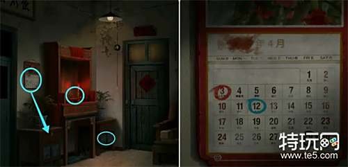 跟随系统完成教学,在触发二爷爷与娇妻剧情后观察墙上的挂历(不同颜色标记的日期),然后结合下方抽屉上的挂锁(蓝红黑)获得密码120329。