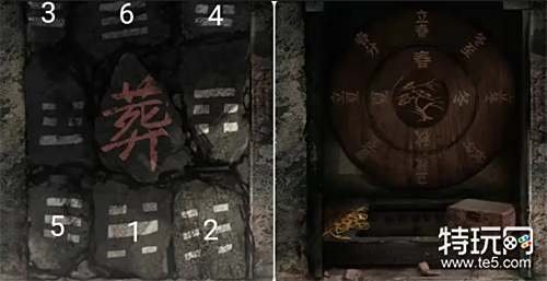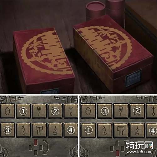 回到外面将托架放在香炉后面的供台上,再将玉簪放上去完成献祭,然后观察铜镜里出现的八卦符号提示,接着到山洞按上图打开桌子上的盒子获得一张纸条。