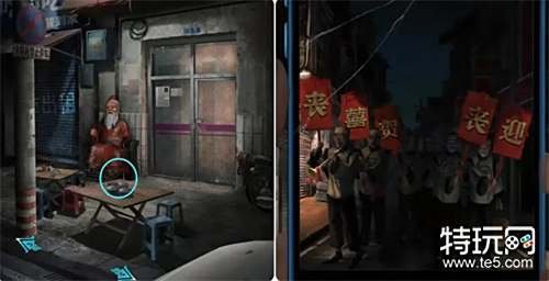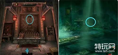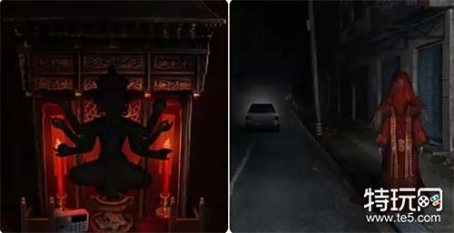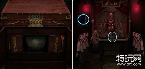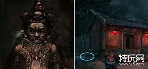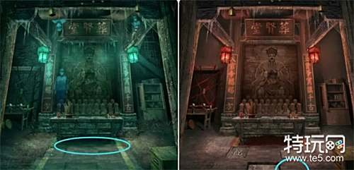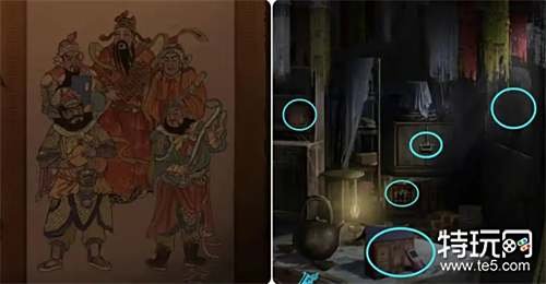 观察打开的五路财神画(手里的道具),然后到外面将收集到的小物件放在五路财神雕像上并按正确的位置摆放,之后进入殡葬店拿走桌子上的纸扎手机和纸扎寺庙。