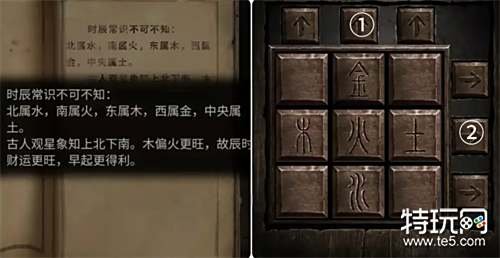 到外面将阴阳玉放在墙上的机关上,然后按上图的顺序点击按钮完成机关,接着观察出现的新提示。