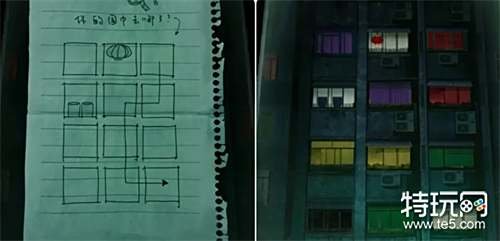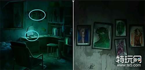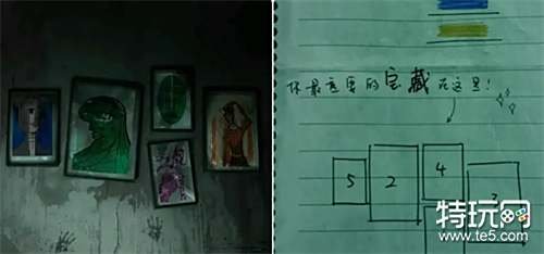 观察墙壁上的五幅图画(注意它们的颜色),然后回到主卧结合纸条上的提示(顺序)输入颜色密码紫绿橙绿蓝打开梳妆台的抽屉获得照片。