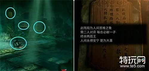 切换到娇彤用拐杖将佛头移到重力机关上,之后切换申墨卿进入地下暗室,先与娇彤对话结束后根据牌子上的提示完成棋局获得阴囍字,再拿走右边石碑处的火柴。 注:娇彤执黑棋先行,这里只需要根据象棋规则各自吃掉对方的棋子,无将军之说,只需要最后剩两个将帅即可(对应步骤:卒吃馬;仕吃車;馬吃仕;車吃馬;卒吃車;帅吃馬;将吃兵;帅吃卒)。