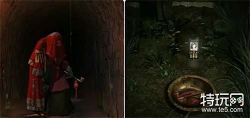 拿走桌子上的拜神金纸转过身遇到纸人和鬼新娘(迷之可爱),在鬼新娘的帮助下从甬道中出去并拿到纸人手里的纸扎烟袋。接着到棋桌右边的石碑处移动铜盆,将老人机放在石碑前,再将烟袋放在铜盆中点燃,之后切换娇彤拿走旱烟袋。