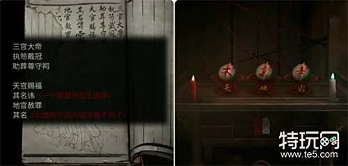 切换申墨卿从地宫出来触发与汤婆婆和二爷爷的对话,接着到菩萨庙将拜神金纸放入功德箱获得阳囍字,观察功德箱里的水宫画像,然后回到宗祠开始封煞仪式。 1.通过切换视角将阴阳囍字放在宗祠左边桌子的凹槽内。 2.切换视角的同时分别用火柴和旱烟袋点燃两边的蜡烛。 3.观察功德箱的水宫画像;地下暗室里的地宫画像以及宗祠书柜上密字书(需要切换到申墨卿视角)可以获得三个对应天地水的密码(名讳核心部分天宫为木;地宫为京;水宫为辛)。