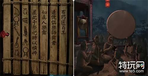观察云锣上方的竹简并记住锣鼓的敲击顺序(以锣开始),接着点击石俑开始敲锣:乐师奏乐三次后敲鼓;奏乐一次再敲鼓;最后奏乐两次敲锣。 注:石俑右下方可以捡到「断箭」。
