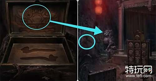 根据香炉上的提示来到戏台前,点击石狮子的底座按331521的顺序完成机关,然后从狮子嘴里获得钥匙。