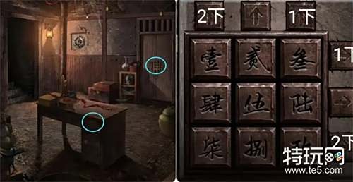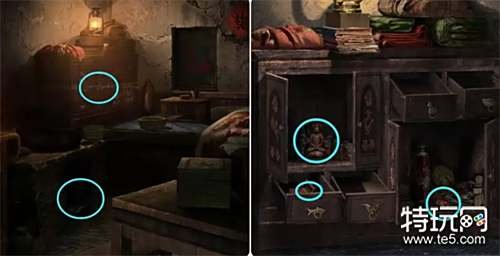 观察出现在茶碗上的提示,然后完成桌子旁边的箱子上的机关拿走里面的钥匙,接着回到二爷爷屋里用其打开右边的柜子拿到一把钳子。