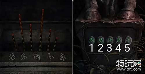 回到外面点击香炉,根据之前获得的提示把握时机用火柴按顺序点燃香柱,完成后在香炉上获得新的提示。 注:注意第一根香燃烧的位置,在它即将烧到上图所示的位置时按顺序点燃其它的香柱。