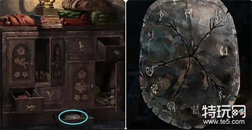 进入里面的房间点击灶柜(注意柜门上的图案)根据前面获得的提示打开龙、玄武、鱼和元宝的柜门和抽屉,再将其它的都关上,完成后获得龟甲。