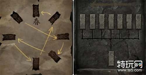 来到外面多次爬坡欣赏剧情后到坡顶点击石碑再点击纸条观察出现的提示,之后移动下面的机关按从右往左的顺序排列节气,完成后获得招魂符。