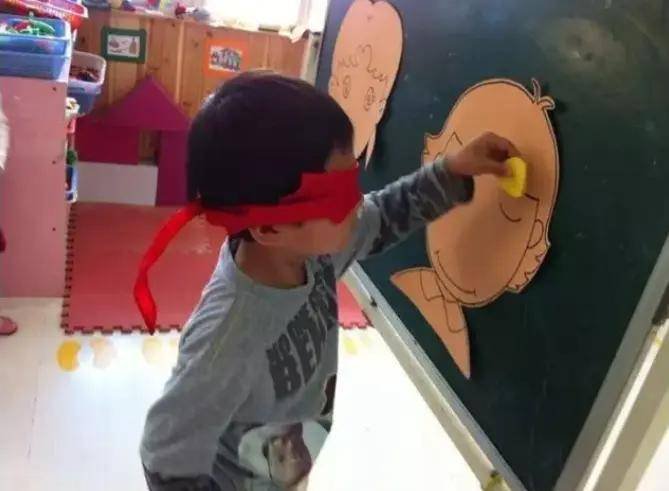 准备内装少许水的水瓶6个,皮球1个。 在场地上将6个瓶子摆成三角形,爸爸、妈妈、孩子分别站在距瓶子3米或5米的起点线后。游戏开始,三人交替持皮球模仿打保龄球的动作对准瓶子用力将皮球沿地面抛出,击倒一个瓶子得分,看谁打得准得分多。 7.蒙眼睛贴鼻子