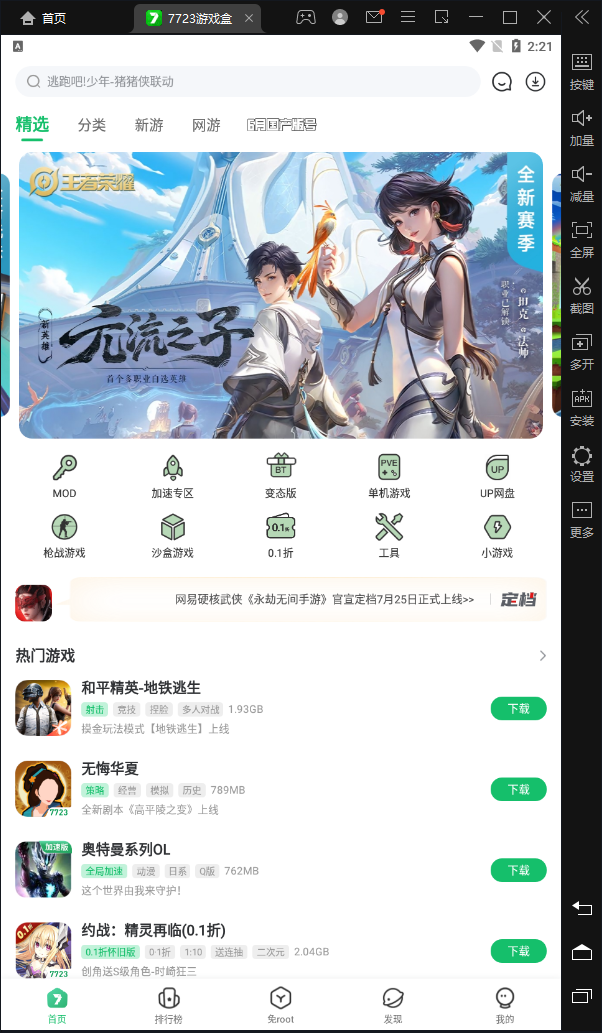7723游戏盒电脑版是借助安卓模拟器而在电脑上运行的一款游戏辅助软件,专为喜欢玩游戏的朋友打造的,拥有海量游戏资源,不管是角色扮演、动作射击,还是休闲益智、经营策略,你想要的的这里全都有。最重要的是,软件拥有超过万款破解游戏供你挑选,涵盖了内购破解、无限金币、无限钻石、无限元宝等破解游戏,通通免费让你,无须花钱就能享受无限资源的乐趣,帮助你轻松秒杀RMB玩家。同时,软件提供了安全实用便捷的游戏辅助工具,具有排行搜索分类、评论、本地软件管理,可以帮助玩家轻松找到好玩的游戏。 另外,7723游戏盒采用了最新的压缩和P2P下载技术,减小了游戏体积的同时让游戏下载更快,无需等待即可畅快玩家游戏。这里所有的游戏都经过多重权威杀毒软件层层检测筛选,确保无毒无木马,给玩家提供一个安全放心的游戏世界,有需要的用户欢迎下载体验。