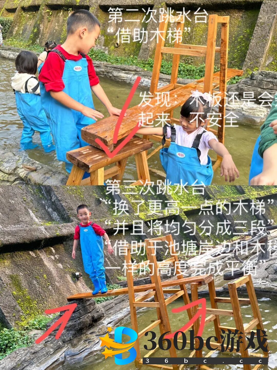 第二次跳水台:小朋友借助了木梯,换走了老师,但发现木梯的高度不一致,跳水台容易滑落、翘起,不安全。第三次跳水台:小朋友们将矮的木梯换成了高一点的木梯,并且发现水渠岸边有一处高地可以利用,能将跳水台的两边同时支撑起来。第三次经过实验,跳水台成功搭建。 教师思考:孩子总是对新鲜事物充满好奇心和新鲜感,丰富充足的材料对幼儿的探索和发展都起到了很大的推进作用。在这次游戏中搭建跳水台的小朋友遇到了难题——“怎样才能搭建一个安全的跳水台”时想到的第一个办法就是求助老师,而其他的小朋友在遇到同样的问题时,也选择放弃,可见他们还没有形成自主研发、自我思考、自我解决问题的意识。为了让他们进一步思考和观察,老师没有直接告诉他们问题的答案,而是引导他们自己去寻找,这对幼儿游戏水平提升会有很大的帮助。 2、水上乐园我的发现: 幼儿初步感知水的沉浮原理