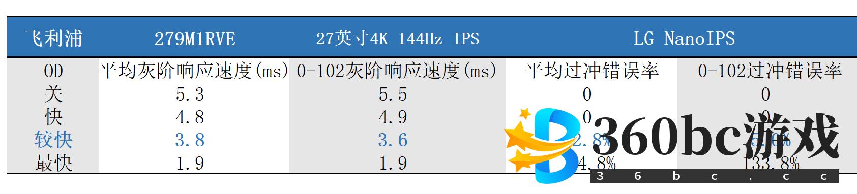 飞利浦279M1RVE是27英寸4K 144Hz IPS显示器,其面板是LG的NanoIPS,同上一代“机皇”LG 27GN950。这是目前最好的4K 144Hz面板,性能远超目前常见的友达2.3和群创E7B等。和普通4K 144Hz显示器不同的是,飞利浦279M1RVE因为面板优势,从而拥有了高达98%的DCI P3覆盖率(基本是目前游戏显示器中最高水平),极快的响应速度,极好的观感以及HDR600支持,这些特性都是其他面板所不具备的。 实际上,如今4K NanoIPS显示器已经有了不少款,飞利浦279M1RVE的售价5199元,并没有很明显的价格优势(别家有4999元的)。但它可能是所有同面板显示器中最特殊的一款,因为它有着独一无二的环景光特效。 何为环景光特效?请看图。下图是我前几天实际拍摄的,并没有使用任何PS和后期,也没有加补光灯。 ![]() 飞利浦的环景光特效和一般的显示器RGB灯不同,大部分显示器RGB灯都在背面,玩家在使用显示器的时候其实根本看不到灯。而环景光特效能够把光效散发到屏幕周围,让玩家在显示器的正面也能看到灯效。 此外,在环景光的“光影同步”模式下,显示器周围的灯光颜色会根据屏幕中显示的图线变化而改变,从而实现“屏幕内容向现实世界的延伸”,这种延伸可以带来更好的游戏沉浸感,大幅度增加(单机)游戏体验。 注:FPS和竞技游戏中不建议使用光影同步,绚丽的灯光可能会吸引玩家的注意力,从而干扰判断。 下图就是光影同步效果展示,屏幕左边和上下是红色只有右边是蓝色,那灯光也会按照屏幕颜色来分布,即左边蓝,上右下红。光影同步效果肉眼看起来比照片中要好很多,照片中因为相机设置问题导致蓝色不够明显。 ![]() 此外,还有“光音同步”模式,也就是让灯光随着游戏声音/音乐进行有规律的波动。 那么,有人会问,环景光的意义是什么呢? 答:当然是看起来很cooooooooooool啦! 环景光是如何实现的呢? 其实很简单,显示器背面四周有一圈LED灯(底部也有,只是挡住了没拍出来),内部还有一个特殊的灯效控制芯片。秘诀正是在芯片上,LED灯谁都能做,但是显示器上控制灯实现光影/光音同步的芯片,目前似乎只有飞利浦一家。毕竟,飞利浦是做照明起家的! ![]() 飞利浦279M1RVE属于飞利浦的旗舰系列,所以它有很好的做工和质感。自带遮光罩,其作用大概是帮玩家减少来自外界的干扰。遮光罩可以拆下来,我就不喜欢用遮光罩,看起来怪怪的,这可能是因为我家只有我一个人,没人会干扰我。 ![]() 虽然外观看起来平平无奇,实际上质感比照片里要很好多,丝毫没有粗制滥造的塑料感。如果不是环景光灯效的话,它在整体上应该偏向于商务风格,成熟稳重,低调内敛。 ![]() 接口方面从左到右:(外置)电源,65W USB-C,DP 1.4(支持DSC),HDMI 2.1 (3个),耳机,USB-B(上行),USB-A(4个)。OSD采用的是非常舒服的摇杆操作。此外,这个角度也能看到底部的LED灯。 ![]() 在图像无损(444,完全动态范围)的情况下,USB-C提供65W的反向充电,给轻薄本使用是足够了,单线就可以同时实现4K 144Hz 8bit输出+激活USB-A扩展接口+充电。此外,DP线可以实现4K 144Hz 10bit,HDMI 2.1可以实现4K 144Hz 12bit。当然,前提是显卡必须支持DSC(RTX20系及以上)或者HDMI 2.1(RTX30系)。 USB-A方面,黄色的接口可以在关机状态下给手机充电,蓝色则不可以。单线连接,即只通过一个USB-C线连接笔记本和显示器,USB-A扩展接口可以激活。双线连接的话,DP/HDMI+USB-C,无法激活USB-A扩展接口;DP/HDMI+USB-B,可以激活USB-A扩展接口。 首先需要重申,NanoIPS是4K 144Hz面板中观感最好的。凡是NanoIPS显示器,观感基本上都明显超过其他IPS面板的显示器。此外,未来可能会有NanoIPS面板搭配MiniLED背光的组合,那就是强强联手,天下无敌了! 0-100%亮度都是DC调光,不闪屏。 抖10bit,接HDMI 2.1也可以调到12bit,不过和10bit无区别。 广色域是NanoIPS的拿手好戏,在默认模式下,达到了惊人的98% DCI P3覆盖率,也可以切换到sRGB模式以消除过饱和问题。 ![]() 默认模式下,白场亮度55~448nit,黑场0.09~0.47nit,对比度900左右。对比度并不算高,这是NanoIPS的天生缺陷。 sRGB模式就比较惨了,亮度锁死457nit,虽然对比度提高到1040,但是亮度锁死意味着:它基本没有实用价值,没人能够忍受450nit作为日常使用,这个亮度对于日常使用来说实在太高了。 ![]() 279M1RVE有HDR600认证。在HDR下,亮度可以达到770-800nit,远超HDR600的标准,比27GN950还要高100nit,而HDR下对比度可以达到4000。 HDR600相比HDR400是质变,HDR600能够让暗处更暗、亮处更亮,从而展示出更好的明暗光影效果、也能更大程度地还原游戏本来的面貌——没错,HDR400游戏的真实色彩和亮度并没有得到充分体现。 ![]() HDR600认证意味着它拥有分区控光。根据测试,分区数为16个,是直下式而不是棋盘式。 ![]() 这里简单说下分区控光。显示器是由面板+背光组成。一般显示器的背光灯珠只能同亮同灭,亮起时所有灯珠的亮度也是几乎一样,也就是“全局控光”。显示器只能通过滤光片遮挡光线来控制屏幕各个区域的亮度。但是因为光线无法被100%遮挡,所以传统显示器在显示黑色的时候会有发灰或者泛白的问题,也就是“暗不下去、黑不起来”。 高端点的显示器会有“分区背光”,一般是8-32个分区,即把背光灯分成8-32个区域,每个区域的亮度都可以独立控制,这样在显示黑色的时候,就能让黑色位置对应的背光灯关闭,从而让黑色能够真正“黑起来”。分区背光有直下式和棋盘式。直下式背光就是每次亮起一整个条状区域,一般8-16个分区