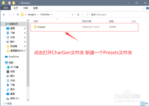 点击打开CharGen文件夹,新建一个【Presets】文件夹,如图所示: