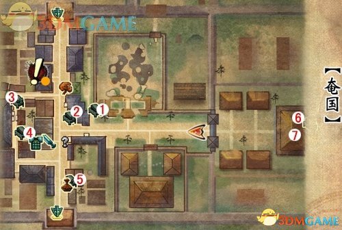 接下来做阿碰、吴恶不作、阜东大人、毛兽、屈先生五个人的支线,他们的收集物都在奄国、蒲姑、朝歌、牧野和镐京五座城镇中,地点一起标注。 DOMO工作室任务城镇收集图