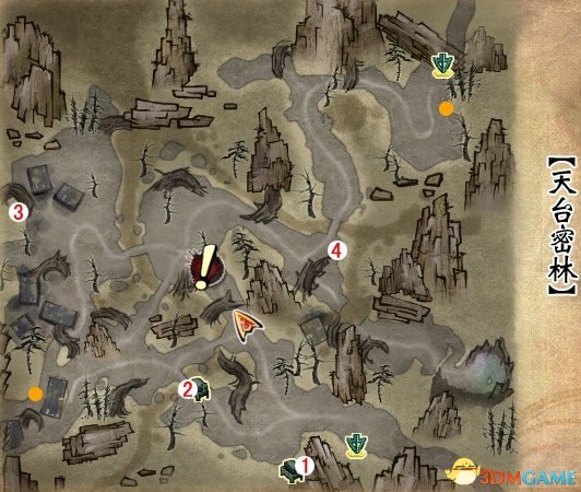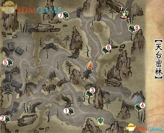 1:腐骨蚀心膏、神秘果 2:神农药饮、水月镜袍(凤天凌) 3:透骨钉、还魂丹(迦兰多) 4: 广灵丹、回雁钩 《轩辕剑6》地图14:天台密林(日) 宝箱×8