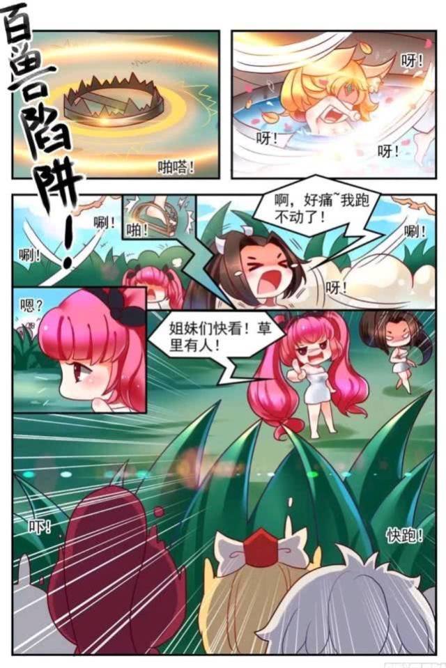 第四张图,可是呢,成吉思汗的一技能虽然能照亮天空,但是技能之间存在时间间隔,总是一会亮一会暗。于是呢,成吉思汗向温泉的方向使用了二技能百兽陷阱,这时天空瞬间被亮光笼罩,十分刺眼。吓得妲己、不知火舞等人直接从温泉中跳了出来。“哎呀!什么东西夹到了我的脚,疼死了!我跑不动了!”原来是不知火舞不小心踩到了成吉思汗的陷阱。这时,安琪拉察觉到了草丛中有动静,于是指着草丛大喊道:“姐妹们,草丛中有色狼,我们被偷窥了!”