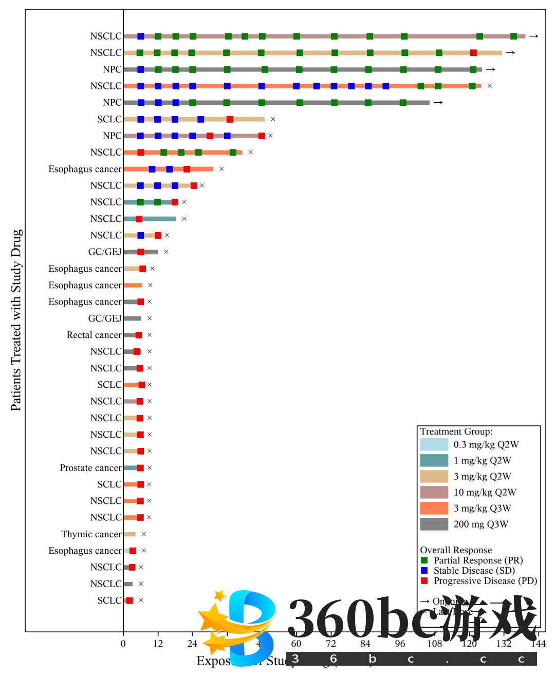03 安全性、耐受性和疗效结果 在艾帕洛利单抗3 mg/kg每2周1次(Q2W)组的6例患者中,1例(16.7%)患者(胸腺癌)发生剂量限制性毒性(DLT),为3级重症肌无力和免疫介导的肌炎。在拟定最高递增剂量10 mg/kg水平未出现DLT,因此未找到明确的最大耐受剂量(MTD),耐受性良好。 共有94.3%(33/35)的患者发生不良事件(AEs),其中82.9%(29/35)为药物相关不良事件(TRAEs)。安全性特征与既往报道的PD-1单克隆抗体一致。最常见的TRAEs(≥10%)为疲劳(37.1%)、贫血(22.9%)、血促甲状腺激素增加(17.1%)、天门冬氨酸氨基转移酶(AST)升高(17.1%)、丙氨酸氨基转移酶(ALT)升高(14.3%)、白细胞计数减少(11.4%),皮疹(14.3%)和瘙痒(14.3%)。大多数TRAEs为1至2级。3级及以上TRAEs发生率为17.1%(6/35)。未发生5级TRAE。 共有17例(48.6%)患者发生免疫相关不良事件(irAEs),最常见的irAEs为血促甲状腺素升高(17.1%);4例(11.4%)患者发生3级及以上irAEs,3例(8.6%)患者发生输注相关不良事件(均为1-2级)。 安全性数据显示,艾帕洛利单抗安全可管理,未观察到新的安全性信号。 共有7例(20.0%)患者达到部分缓解(PR),5例(14.3%)患者达到疾病稳定(SD)。客观缓解率(ORR)为20.0%(7/35),疾病控制率(DCR)为34.3%(12/35)(如下图)。缓解患者的中位缓解持续时间(DOR)为26.64个月(95% CI,2.79-不可评估)。