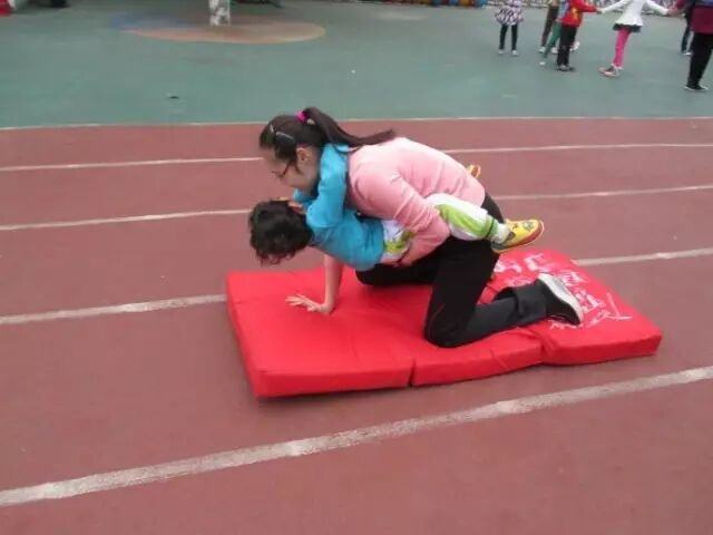 6、小鸟回家 玩法:用8个呼啦圈拼成一个小圆圈,家长站在呼啦圈内当鸟妈妈,幼儿在大圆圈线上自由地学小鸟飞,当教师说出"老鹰来了,小鸟快回家!"时,幼儿赶紧跑回呼啦圈内,投入妈妈的怀抱,先回到家的小鸟获胜。 规则:小鸟须在固定的线上飞行,家长不能离开"家"。 玩法:幼儿与家长分别站在跑道的终点和起点。开始哨响,幼儿拿起乒乓球跑向家长,家长随即将球用球拍托着走回起点。先到者为胜。 规则:托球过程中球不能落地或用手碰球。球落地得回到终点重新走回。 玩法:家长坐在地上,幼儿坐在家长腿上,双手环住家长的脖子。家长利用手脚和臀部的力量向前行进,先到终点的家长获胜。 规则:孩子必须坐在家长身上。 9、火箭发射 玩法:家长双手托住孩子腋下,用力将孩子举高,然后放下,再举起。在一分钟内,举得次数多的家庭获胜。 规则:1、孩子的双手必须平举,不能抱着家长。2、每次放下孩子的双脚必须着地。 玩法:一名家长与幼儿手拉手,将球放在上面,身体侧向迅速前进,先将球运动终点为胜。