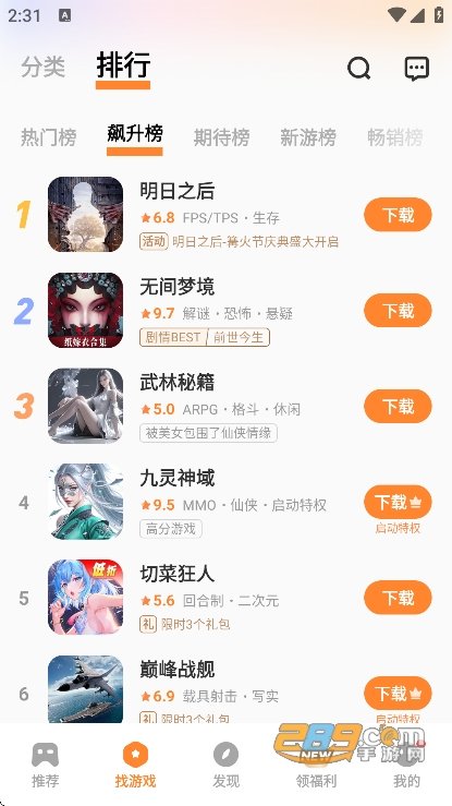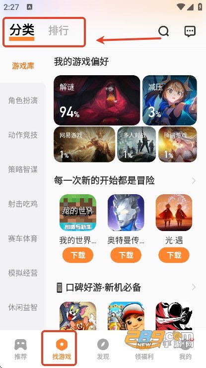 用户们也可以在“找游戏”页面根据游戏分类或者排行来挑选游戏