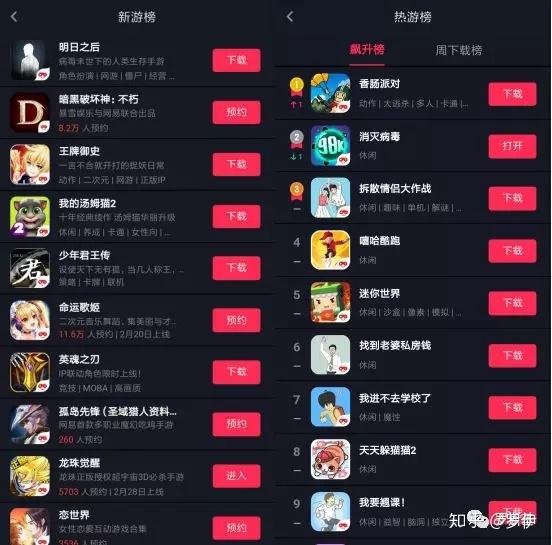 同时,我们也看到抖音在有意向的引导自己平台中的游戏用户。在游戏中心的页面展示方面,抖音游戏中心与常规渠道有细微的差别。有新游榜、热游榜(包含飙升榜、周下载榜)等几部分。