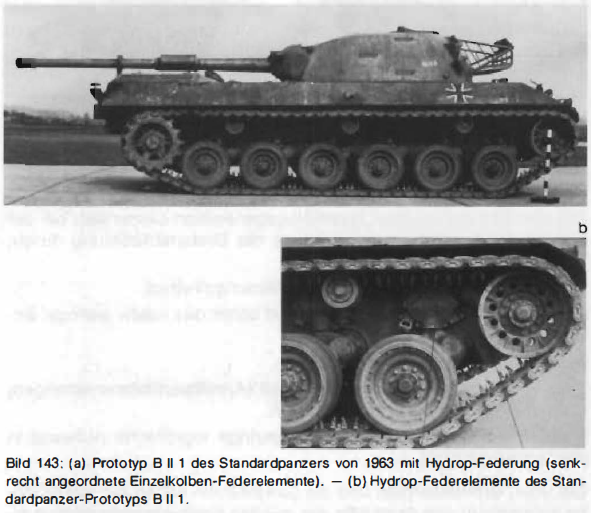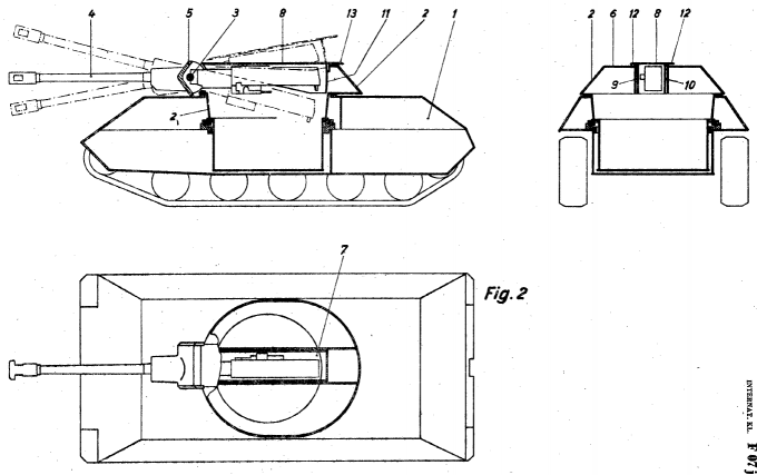 在上一篇文章中我们说到,“昆泽豹”的液气悬挂系统可能来自B组的样车,而它的本体则来自于亨舍尔公司1963年的一份专利。设计思路和“莱茵豹”相同,也是为了在降低轮廓的同时保证俯角,但采用了结构更加简单的前倾式炮塔设计。