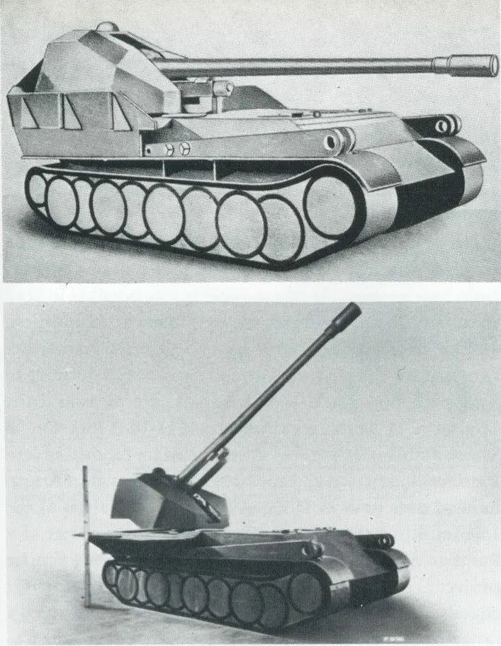 ▲克虏伯的武器运载车后来都统称蟋蟀,包括在虎II基础上开发的蟋蟀17/21 1944年4月,时任装甲兵总监的古德里安向希特勒提出,应当开发出一种能够在4000m距离上击穿200mm装甲的超重型反坦克炮,同年5月,克虏伯拿出了两个方案,一是149mm的15cm StuK L/63,弹重45kg,二是173mm的17cm StuK L/53,弹重72kg。