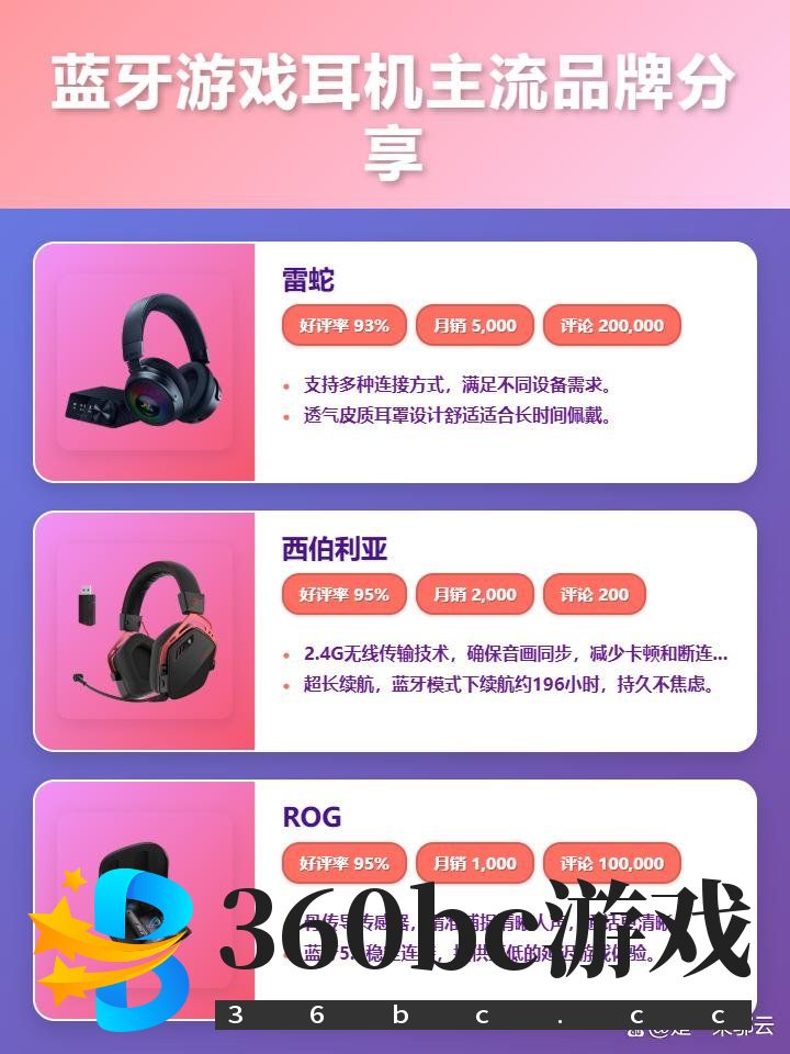 2025年想升级你的游戏装备?那蓝牙游戏耳机必须安排上!市面上蓝牙游戏耳机品牌型号那么多,音质、延迟、续航、佩戴舒适度,各个方面都让人眼花缭乱,不少硬核玩家经常问我:现在蓝牙游戏耳机质量怎么样?什么牌子蓝牙游戏耳机好?的确,选购一款适合自己的蓝牙游戏耳机,确实需要做足功课,要不然很容易踩坑。 ![]() 别担心,这次我就来帮大家省时省力,精挑细选了8款在各方面表现都可圈可点的蓝牙游戏耳机。它们来自罗技、雷蛇、ROG等热门品牌,都是我体验过才敢推荐的。至于哪款更适合你?别急,下面就来看看这几款高性价比电竞耳机的详细介绍,相信总有一款能让你闭眼入! 热售款:雷蛇北海巨妖V4 Pro 雷蛇这款耳机,多种连接方式简直不要太方便,无论是2.4GHz无线、蓝牙5.3,还是USB-C有线和3.5毫米接口,各种设备都能轻松应对。而且它还有OLED控制中心,直接在耳机上调节参数,查看电量,这体验真是太棒了。 ![]() 不得不说,它的音质也很给力。Triforce 40毫米生物振膜驱动单元,声音清晰,低音效果也很震撼。还有THX空间音效,沉浸式的3D音效体验,玩游戏的时候感觉身临其境。 ![]() 另外,这款耳机的亮点还有Razer Sensa HD触觉反馈技术,玩游戏时能感受到多层次的触觉反馈,增强了不少游戏体验。灵蛇技术超宽频带麦克风,语音沟通也清晰多了。 ![]() 雷蛇(Razer)北海巨妖V4专业版Pro 头戴式无线蓝牙电竞游戏耳机耳麦 RGB灯效 THX空间音效 CSGO 三角洲官方指定 ¥3199 京东月销量1000好评率93%无理由退换京东配送 购买 热售款:西伯利亚K03S 西伯利亚K03S游戏耳机,它竟然支持2.4GHz、蓝牙5.3、AUX3.5等多种连接方式!这兼容性真是没话说,PC、手机、平板、Switch,想怎么玩就怎么玩,一个耳机全搞定,可太方便了!而且它还支持无线一拖二,笔记本和手机之间切换音源,再也不用手忙脚乱地重新连接啦。 ![]() 不得不说,这款耳机的音质也挺能打的。它采用50MM大尺寸单元,听声辨位更精准,游戏里的脚步声、枪声都清晰可辨,沉浸感一下子就上来了。而且,它还搭载了XIBERIA强悍音频芯片,无论是游戏、音乐还是看电影,都能体验到更丰富的声音细节,效果真的可以! ![]() 续航方面,它内置了2000mAh大电池,蓝牙模式下能用大约196小时,2.4G模式也能达到201小时!电量这块,完全不用担心。还有,它配备了AI降噪芯片和单指向麦克风,通话质量清晰,有效降低环境噪音。再加上柔软的蛋白皮耳罩,长时间佩戴也很舒服,细节之处做得挺到位。 ![]() 西伯利亚(XIBERIA)K03S无线7.1版2.4G蓝牙游戏耳机头戴式手机低延迟电竞专用智显电脑耳机武士黑 ¥249 京东月销量700好评率97%无理由退换京东配送 购买 热售款:ROG降临TWS Speednova真无线 入耳式游戏耳机 ROG降临TWS耳机在连接方面没的说,蓝牙5.3和2.4GHz双模,随便你切。尤其是2.4GHz模式,延迟那是相当低,玩游戏音画同步,再也不用担心听声辨位慢人一步啦。 ![]() 这耳机降噪也下了功夫,ANC主动降噪,能根据环境噪音自动调节,沉浸感直接拉满,无论是游戏还是听歌,都能给你一个安静的空间。而且它还支持混合多点连接,同时连两个设备,切换起来也方便。 ![]() 外观设计也挺炫酷的,RGB灯效一亮,电竞味儿就出来了。续航也够顶,单次能用11.5小时,加上充电盒,总续航能到46小时,玩一天游戏都没问题。而且,这款耳机不仅仅支持手机和PC,PS4/5也能用,兼容性够强。 ![]() ROG降临TWS Speednova真无线入耳式 游戏耳机 蓝牙无线 游戏手机配件 运动耳机主动降噪 黑色 三角洲 ¥1299 京东月销量200好评率95%无理由退换京东配送 购买 热售款:CHERRY H3W CHERRY H3这款游戏耳机,首先吸引我的就是它的双无线模式了,2.4GHz和蓝牙随便切换,电脑、手机、主机都能用,简直不要太方便!而且它还很贴心地设计了物理快捷键,音量调节、一键静音什么的,操作起来非常顺手。 ![]() 不得不说,这耳机的音质确实可以,53mm的大单元,听个音乐、看个电影,那效果真不错。特别是在玩游戏的时候,脚步声、枪声的方向感都更清晰了,沉浸感很强,感觉自己就身临其境一样。 ![]() 再说说佩戴感受,整个耳机用的是铝合金框架,看起来挺结实耐用的。而且它的重量控制得也很好,只有325g,戴在头上不会觉得很重,长时间玩游戏也不会觉得耳朵不舒服,加上超长续航,可以尽情享受游戏啦。 ![]() ¥50 CHERRY樱桃 H3W无线专业游戏耳机耳麦 蓝牙电竞游戏耳机头戴式FPS CSGO ps5吃鸡耳机打瓦 适配三角洲行动 ¥699 京东月销量200好评率97%无理由退换京东配送 购买 热售款:外星人AW725H 外星人AW725H这款耳机,连接方式上真是灵活,蓝牙、2.4GHz无线和3.5mm有线,想怎么连就怎么连,再也不用担心线不够长或者没电了。而且佩戴舒适度也不错,头戴式悬浮可调节头梁加上柔软耳罩,戴久了也不会觉得夹耳朵。 ![]() 声音这块儿,它有杜比全景声加持,听声辨位更准,玩游戏更有代入感!40mm驱动单元和Hi-Res Audio认证也不是摆设,高解析音频听起来就是舒服,细节满满,声场也够宽阔,听音乐看电影也完全OK。 ![]() 还有个亮点是它的AI智能降噪麦克风,开黑的时候再也不怕吵到队友了,伸缩设计也很方便。再加上AlienFX RGB灯效,颜色随便你调,怎么炫酷怎么来,游戏氛围直接拉满!续航也给力,不用老想着充电的事儿。 ![]() 外星人(Alienware)AW725H 蓝牙无线游戏电竞耳机适配三角洲行动头戴式耳麦三模连接智能降噪长续航 白色 ¥1299 京东月销量100好评率96%无理由退换京东配