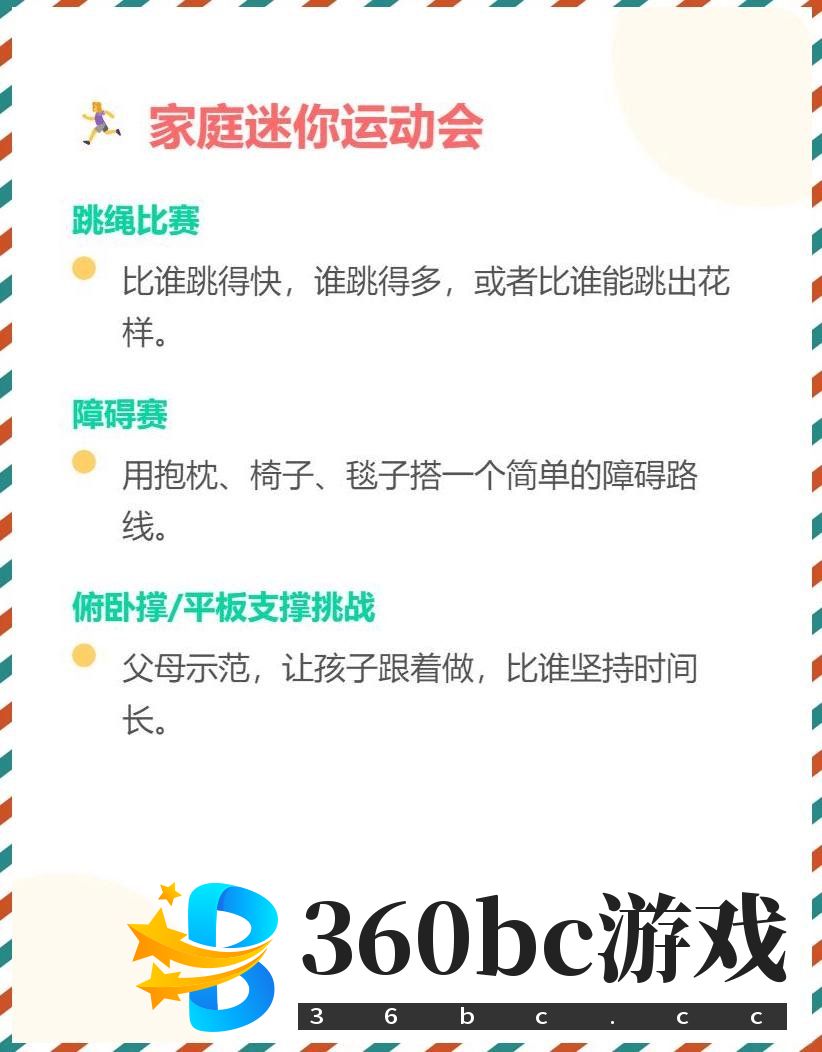 在家中开展跳绳、障碍穿越等活动,帮助孩子们远离屏幕,开展身体运动。 ► 怎么玩 跳绳大比拼:看谁跳得更快、更多,或尝试花样跳绳。 障碍穿越:利用抱枕、椅子、毯子搭建简易障碍,让孩子爬、钻、跳。 力量挑战:父母示范,孩子跟随,进行俯卧撑或平板支撑比赛,坚持为胜。 圈圈乐/投篮游戏:若家中备有呼啦圈或小篮球,可进行简单的投掷游戏。
