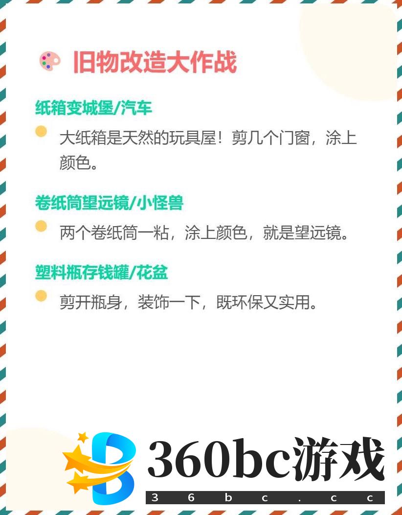 鼓励变废为宝,利用废弃纸箱、塑料瓶等材料,激发家中创造力。 ► 怎么玩 纸箱变城堡/汽车:大纸箱简直就是天然的玩具屋!只需剪几个门窗,涂上颜色,或者巧妙地用胶带将它变成小汽车,孩子们就能在里面尽情玩耍。 卷纸筒望远镜/小怪兽:将两个卷纸筒粘在一起,简单涂上颜色,就变成了望远镜;而画上眼睛和嘴巴,又立刻变成了可爱的小怪兽。 塑料瓶存钱罐/花盆:只需剪开塑料瓶的瓶身,稍加装饰,就能变成既环保又实用的存钱罐或花盆。